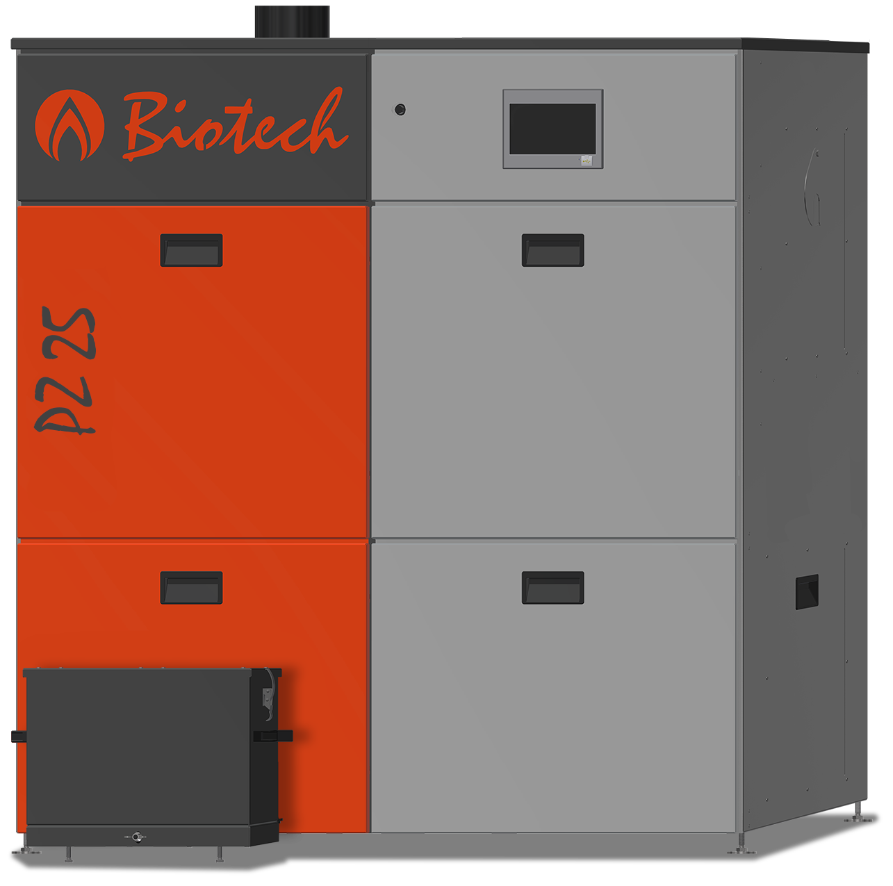 - Pellet hopper for manual filling (optionally upgradable to fully automatic) with approx. 187 kg pellet volume (at a bulk density of 650kg/m³)