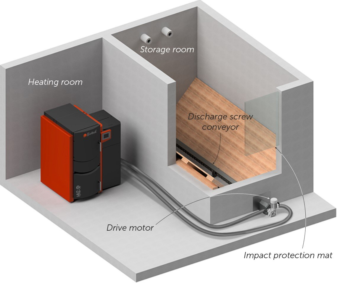 A sloping floor of 45° is essential for this type of storage. The store can be completely emptied as the pellets slide down evenly.