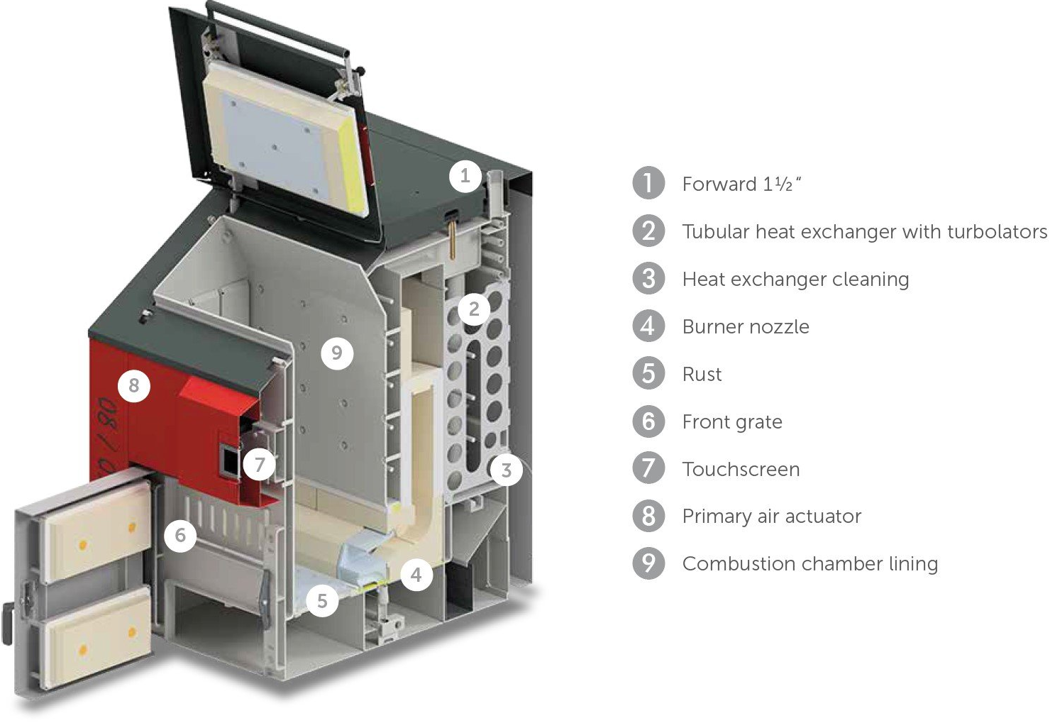 The log boiler works on the principle of the grate burner with a separate combustion chamber. The glowing charcoal is located on the grate surface, which constantly produces new wood gas through the particularly good sliding log wood. Through the flame channel, the wood gas is completely converted into pure energy at high temperatures in the fireclay combustion chamber with the precise introduction of secondary air.