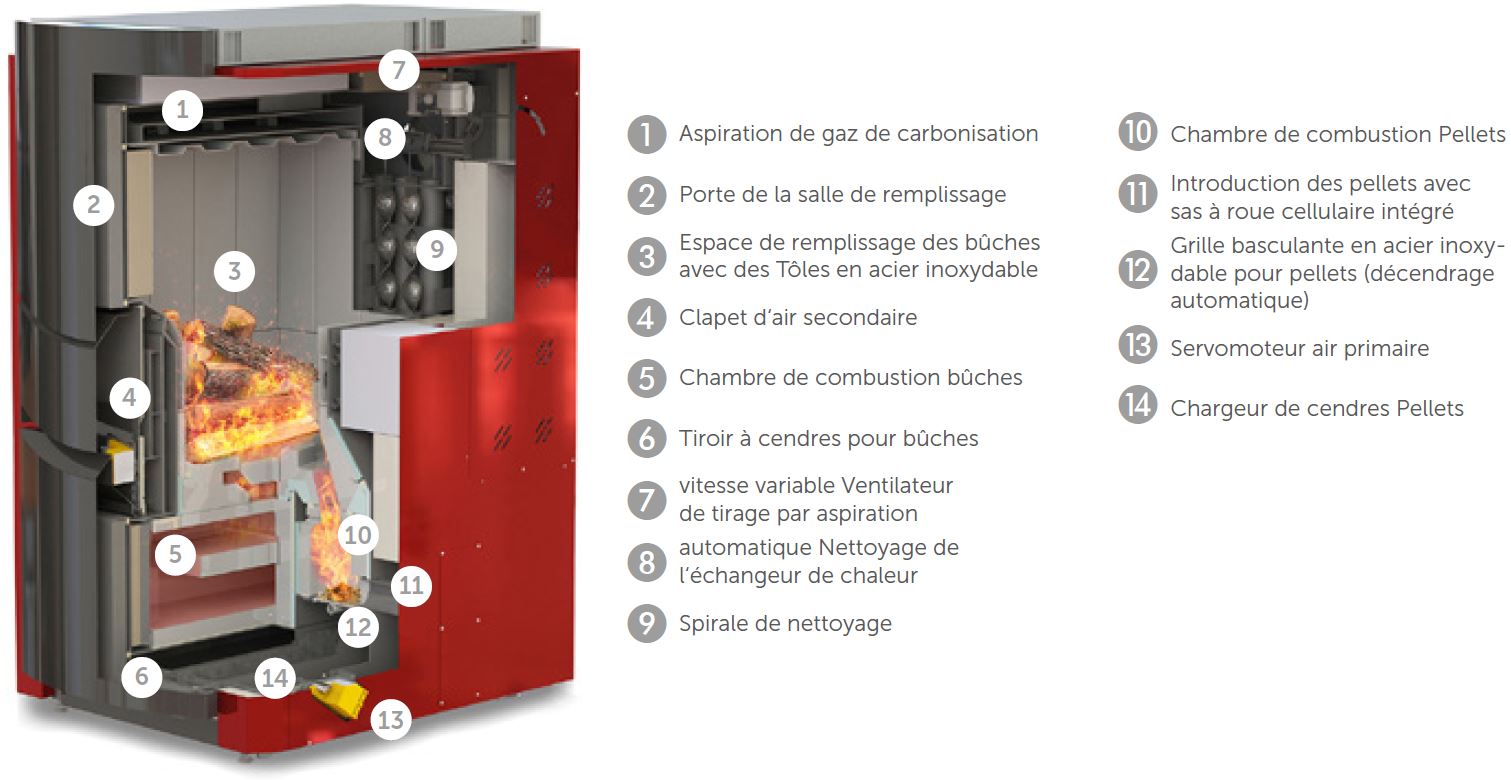 Le résultat de deux systèmes de capteurs est une combustion très propre. Seul le principe avec les 2 chambres de combustion et le système à double capteur associé à une commande intelligente assure l'avantage d'une qualité de combustion très efficace pour les deux types de carburant - même pendant les phases dites de montée en température et de transition. Dans l'ensemble, cela signifie de meilleures valeurs d'émission et une consommation de carburant réduite avec un fonctionnement entièrement automatique sans intervention manuelle. La triple protection contre le retour de flamme protège le silo à granulés d'un incendie causé par des gaz chauds ou même des flammes.