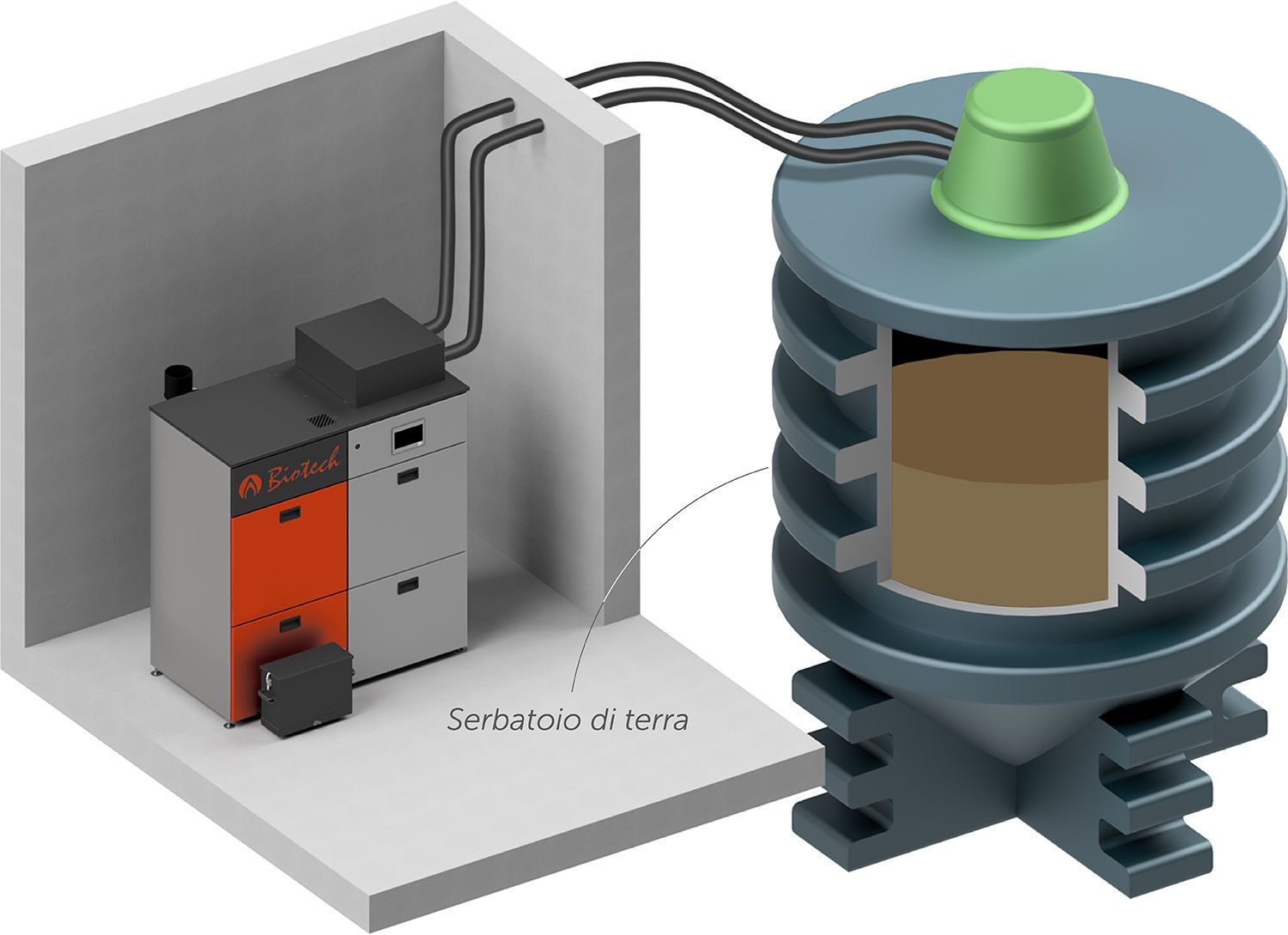 Se non c'è spazio nell'edificio per un deposito di pellet, c'è anche la possibilità di un serbatoio interrato all'esterno dell'edificio. Questa viene interrata e collegata alla caldaia tramite tubi flessibili e alimentati con pellet, perché questi vengono convogliati da una sonda di aspirazione / chiocciola / talpa posta nel serbatoio interrato tramite il tubo di aspirazione al contenitore di accumulo. Il riempimento avviene tramite il raccordo di riempimento fissato al serbatoio interrato. Sono disponibili diverse dimensioni di serbatoi interrati a seconda del produttore.