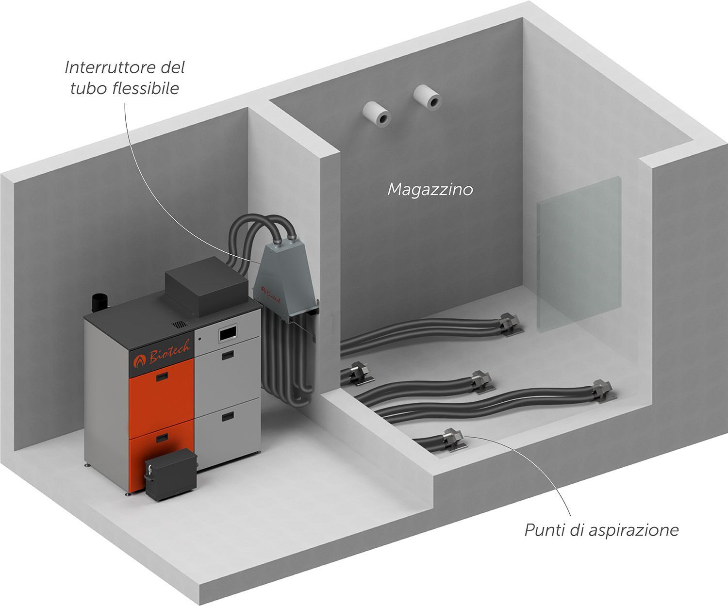 Un possibile modo per scaricare il pellet è tramite punti di aspirazione. Questi devono essere distribuiti al centro della stanza. Il pellet vengono aspirati e drenati delicatamente tramite tubi flessibili caldaia trasportato. Per utilizzare questo tipo di scarico, è necessario un interruttore del tubo flessibile (3 volte o 5 volte). Questi sono disponibili in versione automatica o manuale. Il deviatore automatico del tubo commuta indipendentemente tra i punti di aspirazione, mentre quello manuale deve essere azionato con una leva.